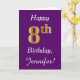 This simple birthday card design features the message "Happy 8th Birthday", with the "8th" having a faux gold-like appearance. It also features a custom name, and a purple background. It could be given to somebody who is celebrating their eighth birthday.
