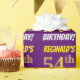 This wrapping paper design features a message like "REGINALD’S 54th BIRTHDAY!", with the "54th" having a faux/imitation gold-like colour appearance, and with the name and "BIRTHDAY" in a fun, bold font. The name can be customised, and the background is coloured purple. Wrapping paper like this could perhaps be used when wrapping birthday gifts being given to somebody in celebration of their fifty fourth birthday. [~Z0000206]