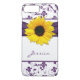 Chic purple and white floral damask, ribbon and yellow sunflower personalised iPhone case. Fun and cheerful. This girly design makes a great gift for her. Personalise it with your first name.