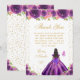 This elegant and glamorous sweet sixteen thank you card features a beautiful princess with dark hair and dark skin in a dark purple ball gown. The text combines handwritten script and modern sans serif fonts for a classy and sophisticated look. The floral arrangements, butterflies and gold confetti create the perfect blend of rustic and chic.