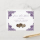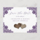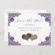 Elegant purple wedding save the date postcard featuring delicate floral lace and two burlap hearts.
