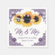 Elegant purple and sunflower wedding paper napkins featuring sunflowers, string lights and delicate floral lace.