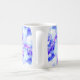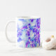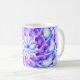 This mug features a luminous abstract floral purple, lilac and magenta mandala design. The colours swirl around a central blue star.
