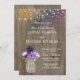 Lilac and plum purple flowers mason jar rustic rehearsal dinner invitations with barn wood and string lights