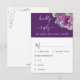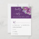 Wedding RSVP card with editable meal options and decorated with a bouquet of purple flowers. This watercolor floral and foliage design features handwritten script typography, purple and gold confetti dots and, buds and blooms with grey green leaves and foliage. Please browse my store for alternative response card, online rsvp and matching items in the Plush Purple Floral collection.