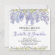 Romantic floral design features purple and blue wisteria gracefully draping across its vine. The vine and just a few flowers frames the bottom of the invitation. The same two borders are on the back of the post-wedding brunch invitation. A wisteria wreath is in the centre with the wedding couple's names. There is a soft purple/blue background on the back and white on the front. You can also change these colours to coordinate with your wedding scheme.