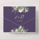 All in one wedding invitation featuring parents' names, botanical greenery rustic leaves, and elegant typography on a purple background. The invitation includes a perforated RSVP card featuring a QR code. Designed by Thisisnotme©