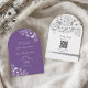 This elegant arched wedding invitation features a modern purple background paired with delicate white floral line art and a classic serif script. The design includes a full photo-free layout on the front with your ceremony details, plus a matching back with a QR code for RSVP and a wedding website link for easy guest access.