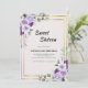 This elegant Sweet Sixteen invitation features a soft watercolor floral arrangement in shades of purple and violet, complemented by a golden border. The design creates a dreamy and feminine aesthetic, perfect for a stylish and sophisticated 16th birthday celebration. Ideal for floral, pastel, or garden-themed parties, this invitation adds a charming and elegant touch to your special event.