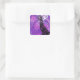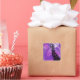 A colourful purple flowered background design featuring the black silhouette of a giraffes head and neck.