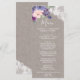 This purple flowers and lace dinner menu card is perfect for a country wedding. The rustic chic design features a beautiful arrangement of plum purple, lilac and blush pink flowers with white floral lace on an elegant linen background. This menu can be used for a wedding reception, rehearsal dinner, or any event.