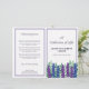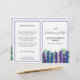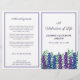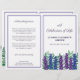 Floral funeral program in white with dark purple fonts, greenery, and blue and purple flowers. On the back you can write the obituary and program. Fold it yourself for a practical program.