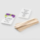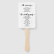 Beautiful floral bouquet with violet purple flowers and cursive script style handwritten calligraphy font floral spring wedding program hand fan. A bouquet of purple flowers and green leaves adorns the upper part.