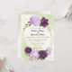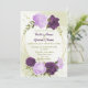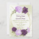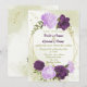 Beautiful wedding invitation featuring lilac and eggplant purple flowers and green leaves on an elegant gold geometric frame.