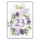 purple flowers greenery wreath table number
