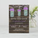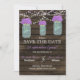 Rustic Barnwood, dangling string lights with purple flowers in a mason jar wedding Save the date. Matching products also available.