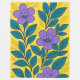 The design shows stylized purple flowers with rounded petals and small white stamens at the center. The flowers are connected by flowing branches covered with elongated leaves. The leaves are drawn in a deep teal color with clear vein details and smooth outlines. The background is filled with a bright yellow color and subtle leaf-shaped patterns that add visual depth. The overall style is clean and decorative, using flat colors and bold shapes to create a fresh and lively floral composition.