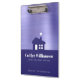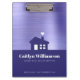 This custom, promotional real estate company clipboard is a terrifically stylish way to showcase yourself to your clients. A dark purple blue simple, graphic modern house icon and bold, white typography on a dark purple blue band overlay a soft shimmer, faux brushed foil metallic purple blue background. Personalise with your name and company plus phone number, website or other copy. The 9”x12.5” size holds up to .5” of paper securely. Makes a chic, professional and elegant statement as an unique leave-behind promotion for your clients.