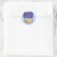 Stickers feature an original watercolor illustration of a purple frosted cupcake on a blue background.