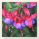 Protect your table top from water marks and stains with this decorative, glass beverage coaster that features a photo image of bicolor, purple Fuchsia flowers with pink sepals. A colourful, floral design!