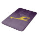 Funny giraffe bath mat with a cartoon giraffe nibbling on a light purple flower and holding some flowers with its tail while roller skating, on dark purple background.