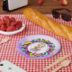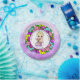 Cute hand drawn whimsical cartoon baby girl holding a teddy bear with purple, red and pink flowers background girl's baby shower plates.