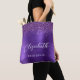 This elegant modern bridesmaid tote bag features a purple faux glitter border. Add her name in white handwriting script and the word "bridesmaid" or other title in sans serif font on a purple faux brushed metal background.