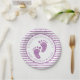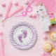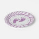 Add sparkle to your shower setup with these personalised purple baby shower paper plates, featuring faux glitter baby feet and a matching striped border. Perfect for a purple, glam, or baby girl celebration, these printed plates can be customised with the guest of honour’s name and event date. A fun and coordinated addition to your stylish party tableware.