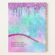 Personalise with purple name, year and white monogram on teal, blue and purple Iridescent background with Purple Glitter Drips. Click “Customise” to change colours and type styles.