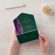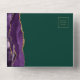 The left-hand edge of this elegant modern all-in-one wedding invitation and RSVP features a purple watercolor agate border trimmed with faux gold glitter. The detachable RSVP card includes space for guests to initial their choice of three entrees. The customizable text combines gold-colored handwriting, copperplate and italic fonts on a dark emerald green background. The return address appears on the outside flap and on the reverse side of the RSVP.