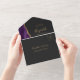 The left-hand edge of this elegant modern all-in-one wedding invitation and RSVP features a purple watercolor agate border trimmed with faux gold glitter. The detachable RSVP card includes space for guests to initial their choice of three entrees. The customizable text combines gold-colored handwriting, copperplate and italic fonts on a dark off-black background. The return address appears on the outside flap and on the reverse side of the RSVP.