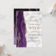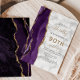 The left-hand edge of this elegant modern birthday party invitation features a purple watercolor agate border trimmed with gold faux glitter. The customisable text combines black and gold-coloured handwriting, copperplate and italic fonts on a grey and white marble texture background. The reverse side features a matching purple and gold agate design.