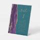The left-hand edge of this elegant modern wedding table number pedestal features a purple watercolor agate border trimmed with faux gold glitter. The word "table" appears in whimsical gold-coloured script on a teal blue background. Add the names of your guests who are assigned to each table.