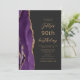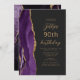 The left-hand edge of this elegant modern birthday party invitation features a purple watercolor agate border trimmed with gold faux glitter. The customisable text combines gold-coloured script and sans serif fonts on a slate black background. The reverse side features a matching purple and gold agate design.