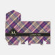 Purple, golden yellow and blue tartan design. Seamless pattern. Custom text and monogram.