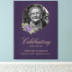 Elegant purple floral photo funeral welcome sign featuring a photo adorned with purple roses and baby's breath.