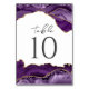 Elegant Purple Agate Wedding Table Number Cards. Faux gold glitter graphics. Script font highlights with easy to read serif name font. Easy to adjust for your own wedding needs. Personalised wedding table cards.