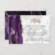 The left-hand edge of this elegant modern wedding details enclosure card features a purple watercolor agate border trimmed with faux gold glitter. The customisable text combines gold-coloured calligraphy script and black sans serif fonts on a grey and white marble background. The reverse side features a matching purple and gold agate design.