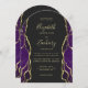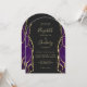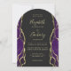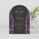 This elegant arch-shaped modern wedding invitation features purple alcohol ink side borders trimmed with faux gold foil and faux glitter. The customizable text combines gold-colored handwriting, copperplate and italic fonts on a dark background. The reverse side features a matching purple and gold design.