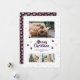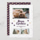 Modern purple and gold photo Meowy Christmas card featuring three photos, snow and paw prints on the front and a paw prints background at the back. Easily personalize this cute photo Christmas card with your photos, family name and the year.