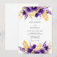 A vibrant palette of royal purple and golden yellow creates a regal and artistic atmosphere for a seasonal ceremony. Hand-painted watercolor blossoms and delicate leafy sprigs adorn the edges, creating a balanced aesthetic. These rich violet pansies and golden ferns offer a sophisticated touch. Set against a clean white backdrop, the saturated pigments provide a striking contrast.