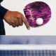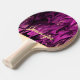 Ping pong paddle with trendy colours and design. Girly and feminine colours. Dramatic goth inspired shades of purple, pink and black colours in waves and swirls making an modern abstract pattern. Personalise with Your name on front, light yellow coloured letters.