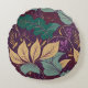 An arty design on purple, with three leaf types in tan, teal, and blue sage. Seamless image.