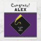 Creative graduation gift labels and party decor featuring classic black graduation cap and gold tassel design on purple background. To personalise edit text to add name and senior class year.