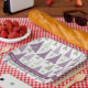 If you are wondering what colour combinations to pick for your Christmas decor and gift wrap supplies this year, I've created collections of coordinating patterns to make life just a bit easier. This Christmas paper plate features a modern graphic design of tiny Christmas trees in a geometric-style pattern of deep purple and green with a template to add your text. Search ID1009 to see other products and patterns in this colour scheme.