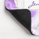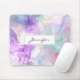 A mouse pad with a beautiful artistic painting. Created with flowing alcohol inks. Purple, green and blue colours flowing together. Thin wavy ribbons of gold intermingle with these soft gentle colours. A rectangle with a faux gold foil border layered over top with your personalised name inside.