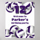 This volleyball themed birthday party welcome poster is fully customisable and features randomly arranged purple, grey and white volleyballs, upon which you can personalise your custom message and the child's age, or customise the text to suit your event - by katz_d_zynes