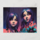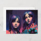 AI generated art of two sisters with purple hair dressed in pink with some blue flowers