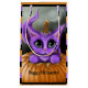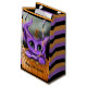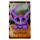 Detail of my "Is I Scary?" painting - a little purple kitty in a carved pumpkin with the top on his head. The night sky, moon, and mist are in the background. The image all over the bag is striped orange, purple, and black stripes. There is a text field on the front and another on the back that you can edit. You can also click on the "Customise it!" button to add more text, images, etc. to create your own design