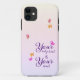 A simple phone case with purple informal handwritten script typography quote in purple on a lilac gradient background with butterflies. The text can easily be personalised for a design, especially for you!